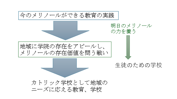この当時、「優秀な生徒を集めれば生徒は集まる」とよく言われ、入試で成績の悪い生徒を入学させなければ、成績優秀な生徒が集まるというような「妙な考え方」を主張する先生方が多かった。この「異様な考え方」に違和感を覚えた私たちは、当時のメリノールが地域のニーズに向き合った学校ではないと感じていました。どのような学校になれば地域のニーズに応え、なおかつカトリック学校であり続けることができるかを考えました。