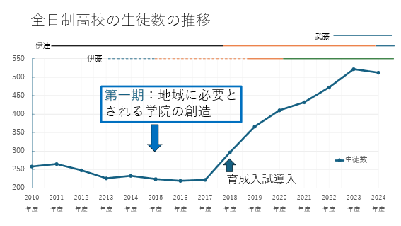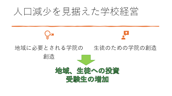 また、私たちのように人口減少の中で生徒数をこのように増やした事例は、多くの人々から珍しい事例だといわれるので、そうかなとも思いますがもっと上手くできたはずと後悔するところばかりです。この事例が参考になるようであれば嬉しいですが、それぞれの学校はそれぞれ必死に努力されているので私たちの考え方は合わないかもしれません。ただ、参考にしていただければと願うばかりですし、ご不明な点やお知りになりたい点などがございましたら全てを開示することを前提にしている学校ですのでお申し付けください。