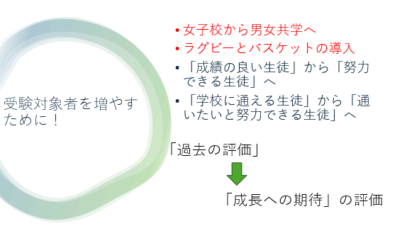 2014年度あたりのメリノールは、中学の受験生が30名程度、高校は300名程度、それでも数名の不合格者を出して、より優秀な生徒集団を作るふりをして頑張っていました。一方、世間一般には、「いつまで持つのか」と考えられていましたし、「潰れるより他ない学校」と考えられ、受験生からは入学を希望する学校ではなくなっていました。そこで、学校を知っていただく努力をすると同時に、この数名の不合格者に注目しました。本当のことを言えば、この不合格者ですら入学したくない学校だったのかもしれません。この不合格者を入学させる新たな基準(考え方)を作りたいと考えるようになりました。言い換えれば、この考え方は「教育現場で生徒に向き合って教えていただく先生方の納得を得る方法」の模索であり、「生徒を送り出す学校の先生方に本校の心意気を示す手段」でもあり、「入学してくる生徒に自信をもってもらう手段」だったと思います。