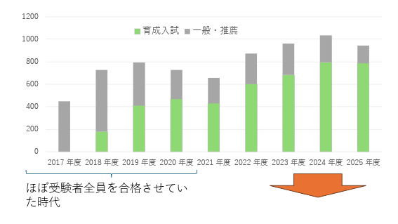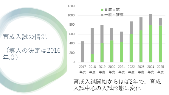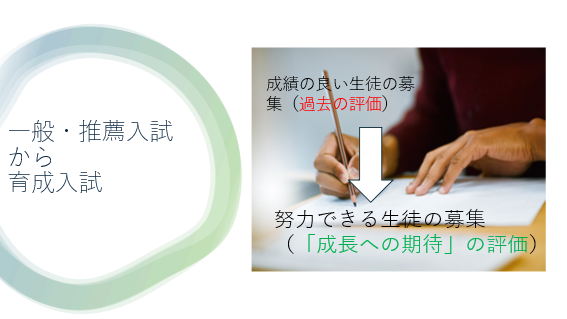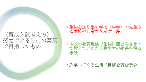 結論としては、育成入試を導入した2018年度から導入しました。入試問題集を出来るだけ早く配布して、受験の応募者に事前に勉強してもらって入試に備えて勉強をしていただくことを入試として提案しました(これを育成入試と呼びました)。この考え方によって、過去の正否や失敗を問わず、努力したいという姿勢をできる限り評価しようとしました。結果として受験者数は育成入試受験者数だけ増加しましたが、本校の先生方にも公立の中学の先生方にもきわめて不評で、わずか数名の先生方が評価してくれるだけでした。