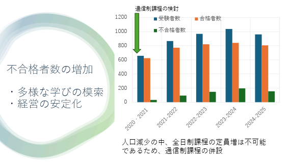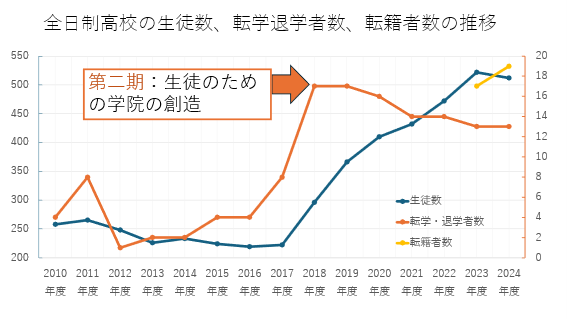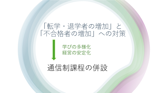 2017年に男女共学にし(聖カタリナ学園の先生にお世話になりました。)、2018年度から育成入試を導入し、2016年から受験生も増え、結果として生徒数は増え始めましたが、学力の低い生徒や不登校気味の生徒も一定数入学してくるために、転学・退学する生徒も徐々に増え、この問題に頭を悩ませました。この問題「転学・退学者の増加」が通信制課程を考えるきっかけになりました(賢明学園の先生にお世話になりました)。