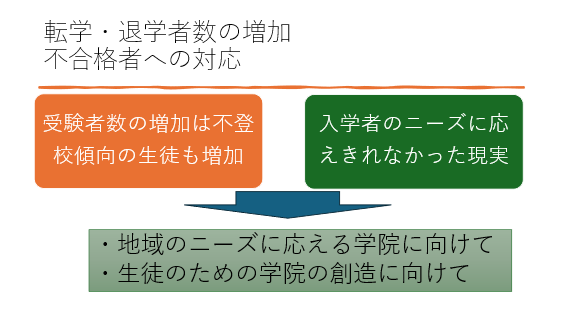 「生徒のための学校」を目指して、入試データの情報開示と育成入試で受験生を増加させることができました。そして「生徒のための学校」を目指すなら、「やり直しのできる学校」であることも必要であると考えました。「私たちと一緒に努力をする意思のある生徒」を求めたのですが、結果としては途中で進路変更をせざるを得なくなる生徒が徐々に増えていき、この生徒たちに対して何か手当をしなければと考えました。このように考えるのは、「生徒のための学校」を目指す本校としては当然と考えました。