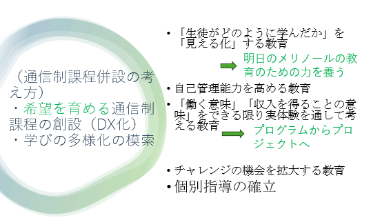 新しい課程を創るときに必要なことは「考える」こと、従って生徒にも「考えさせること」を中心に据えた教育を実施したいと思いました。このために、通信制課程を考え始めたときから企業訪問を実施し、地場産業との連携を図り協力体制を構築し始めた。まだ、道半ばですが、武藤が行っているキャリア教育(学校設定科目)の中の授業は、ラーメン屋、学童保育、映像編集、プログラミングなどのグループ学習が進められようとしています。