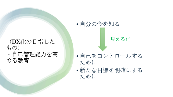 この通信制課程に通う生徒がどのように勉強したかを「見える化」して、大学や就職先にアピールできる仕組みを構築すること、この目標のために、「生徒がどのように学んだか」を「見える化」する仕組みとして、Studentiを作った。この「見える化」を目指したプログラムでは、授業を予約し、出席することで、「自分の計画とその実行率を分析し自己管理能力を測定」する一つの新しい要素を追加すると同時に、従前のスクーリングの出席状況や課題の提出状況、テストの成績もリアルタイムで生徒も教員も確認できるようにして、生徒の「自己管理」能力を高めることを目的としました。