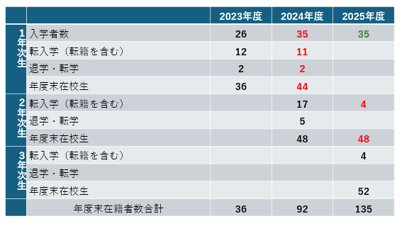生徒数は、下の表のように増えていて、今年度定員増を申請しております(180から360名に)。おそらく今年度中には180名近くにはなっていると思います。