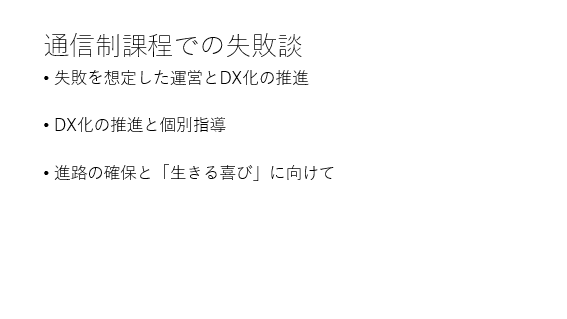 私の偏見かもしれませんが、社会には通信制課程に対するスティグマがあると思っていました。育成入試で入学するために努力できた生徒を、全日制課程に入学後通学させるだけの力がなかった私たちは、一度努力して入学できた生徒を育てることができず、転校させるしか方法がない現実(制度上の問題)に直面させられました。